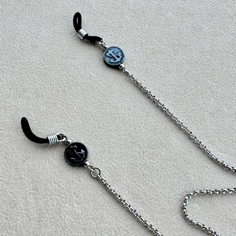 Correntes e Peças em Aço Prateado, Hematite Esculpida 66 cm, Ancora e Roda de Leme .