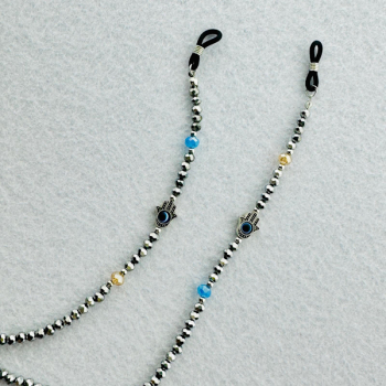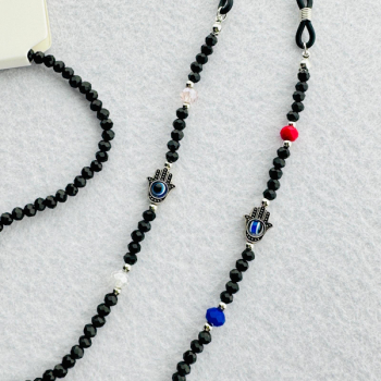 Corrente de Missangas Acrílico Facetado Prateado com Vidrinhos Mão de Fátima com Olho Turco e Pontas em Metal